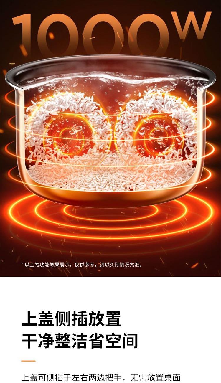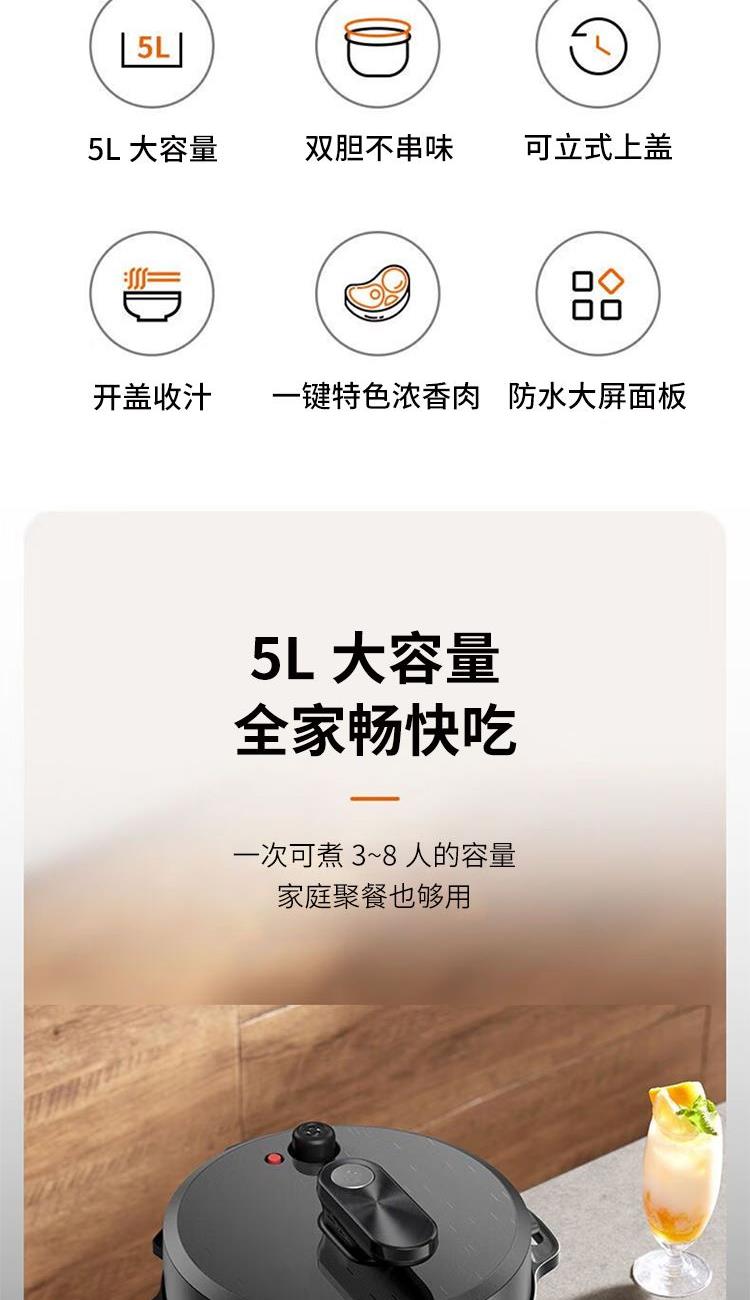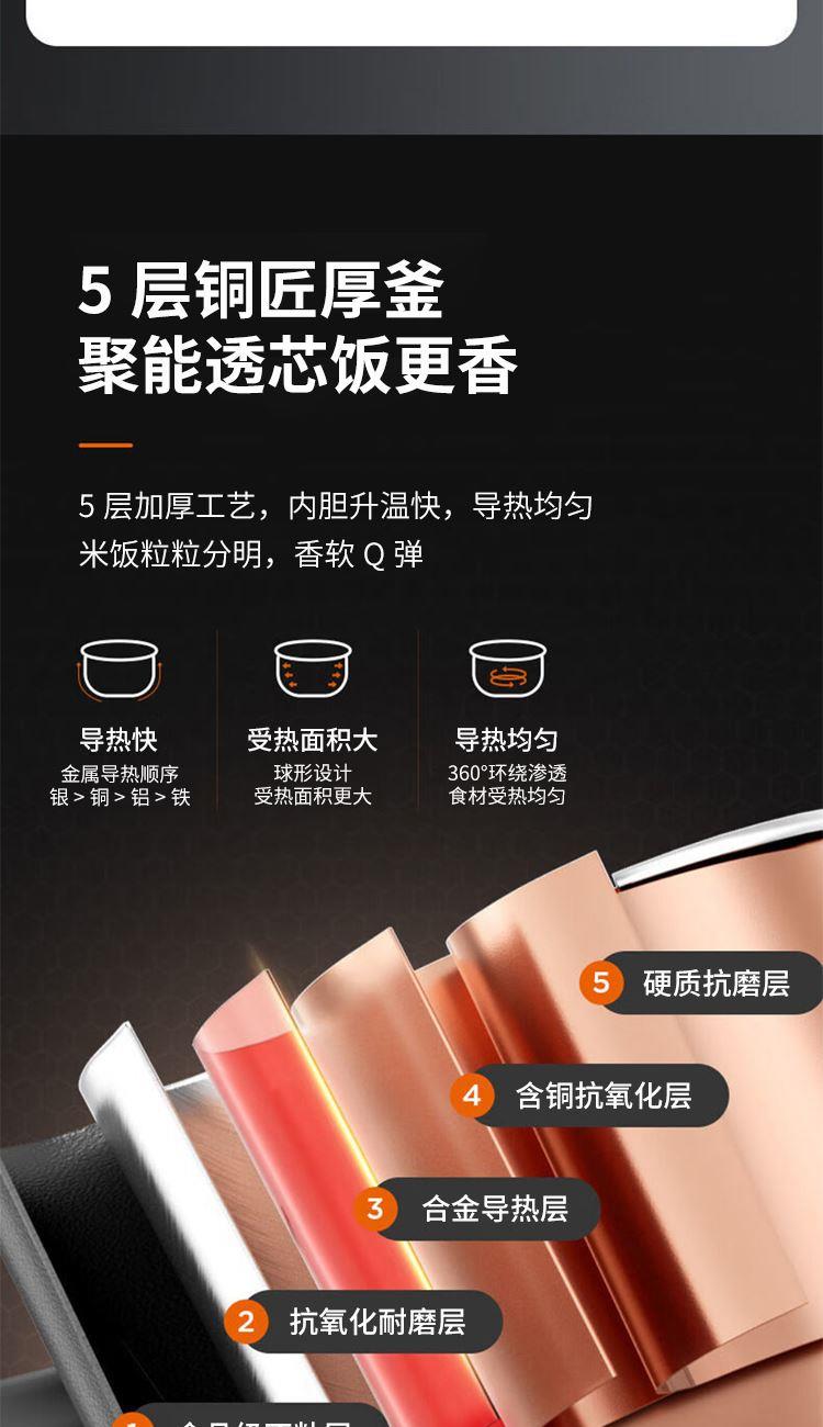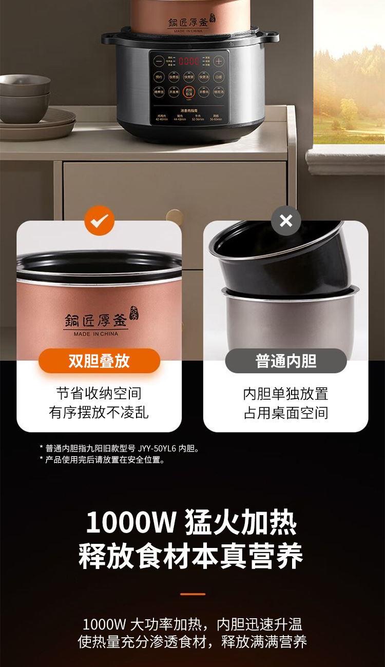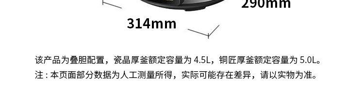 "1、铜匠厚釜内胆,导热强不粘锅; 2、一煲双胆(5L铜匠厚釜内胆+4.5L瓷晶厚釜) 3、底盘加热系统,反向排压按键; 4、开盖收汁,可立式上盖; 5、24小时预约,3档口感可调; 6、容量5L,功率1000W。 "