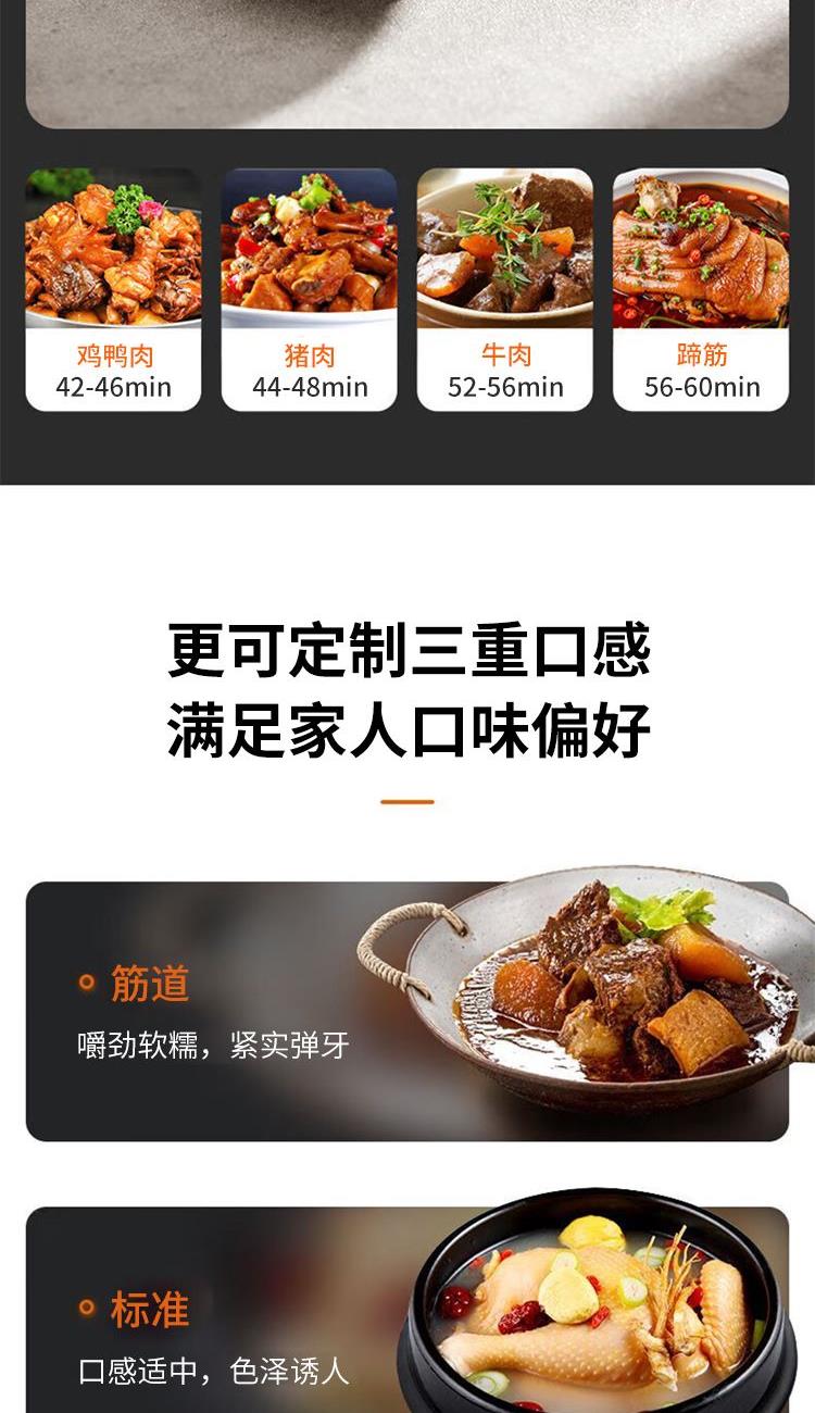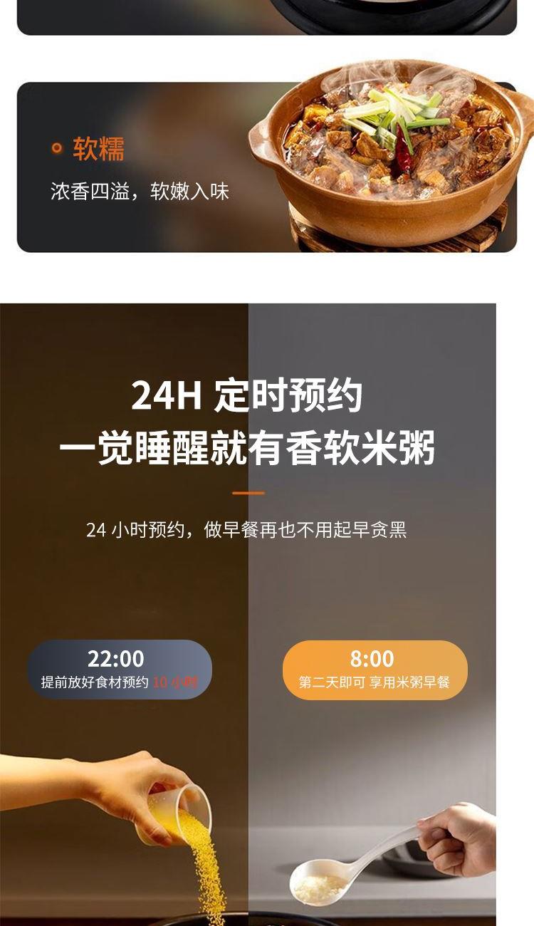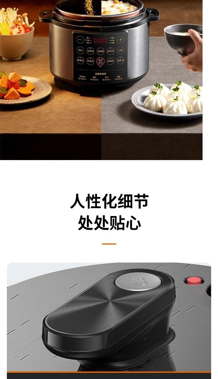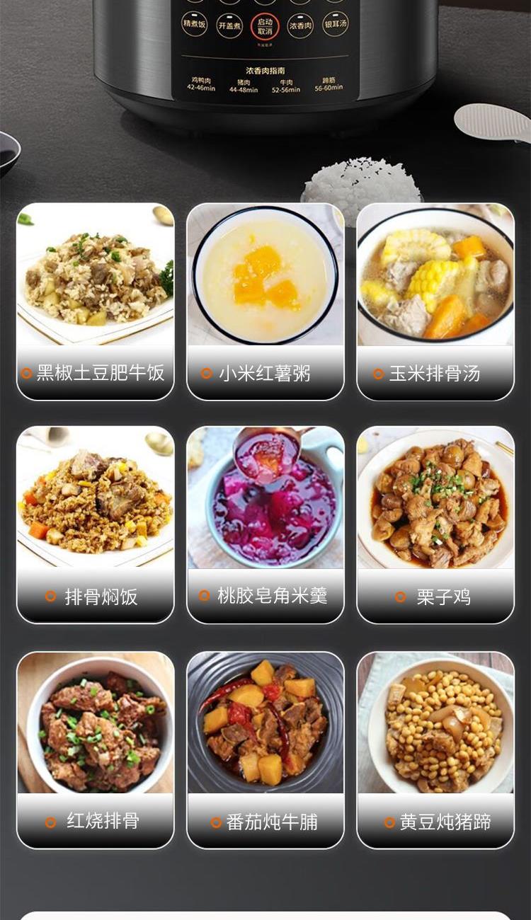 "1、铜匠厚釜内胆,导热强不粘锅; 2、一煲双胆(5L铜匠厚釜内胆+4.5L瓷晶厚釜) 3、底盘加热系统,反向排压按键; 4、开盖收汁,可立式上盖; 5、24小时预约,3档口感可调; 6、容量5L,功率1000W。 "