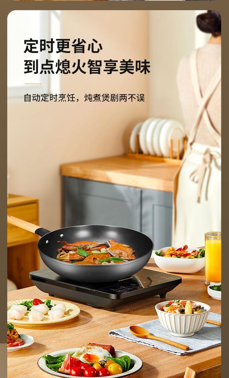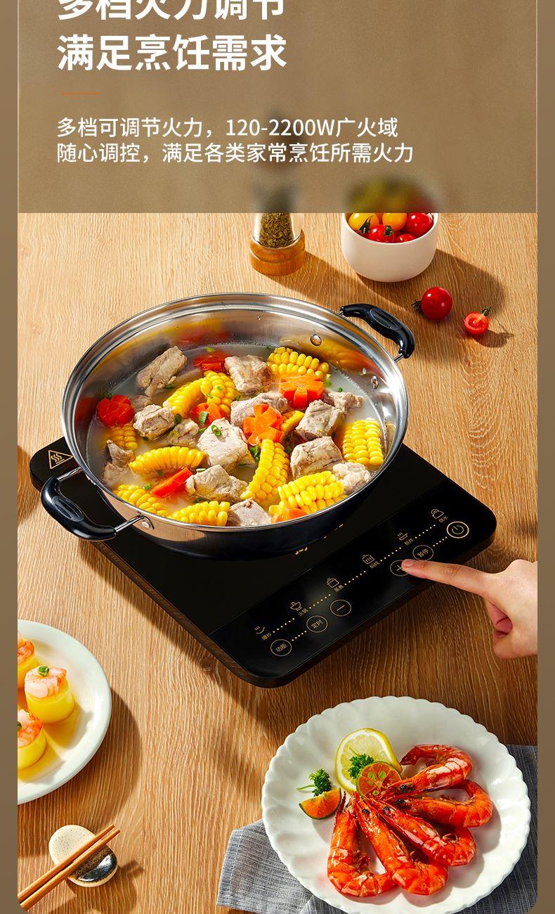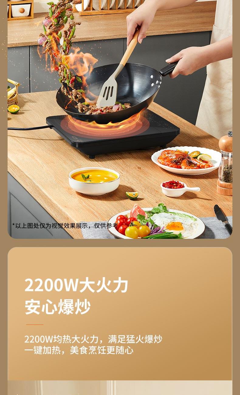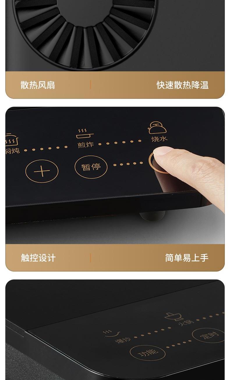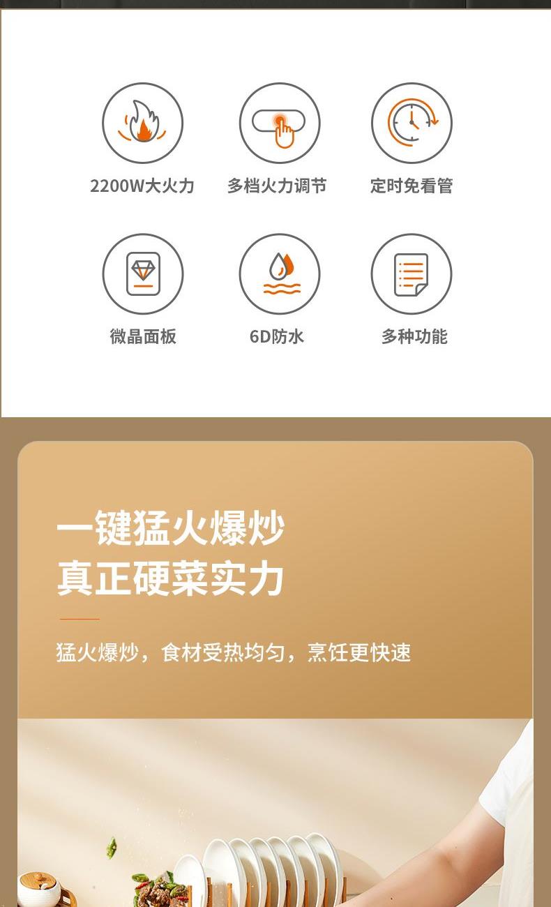 "1、功能:爆炒、火锅、蒸煮、焖炖、煎炸、烧水; 2、3位数码显示,10档大火力; 3、黑晶面板,触控操作; 4、3级能效,多重防水; 5、功率2200W。"