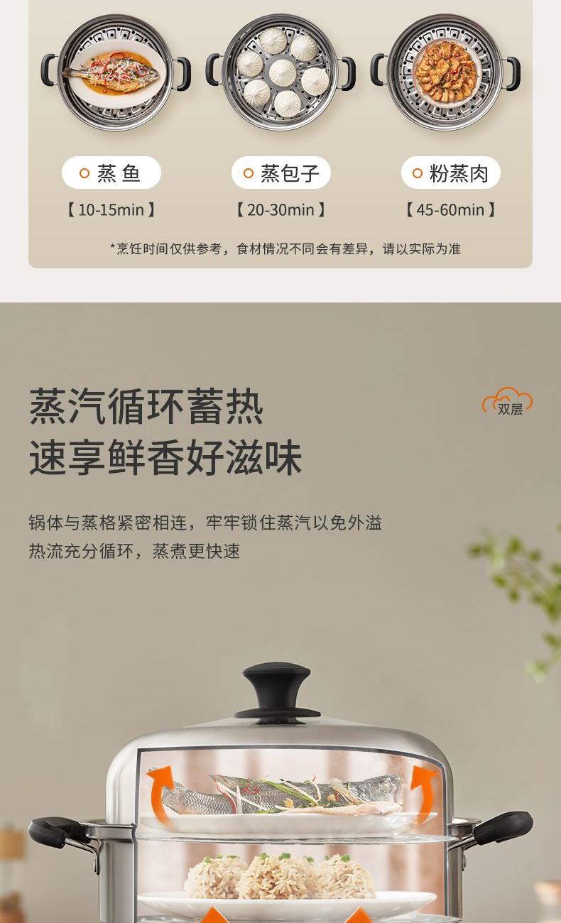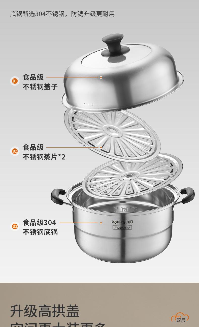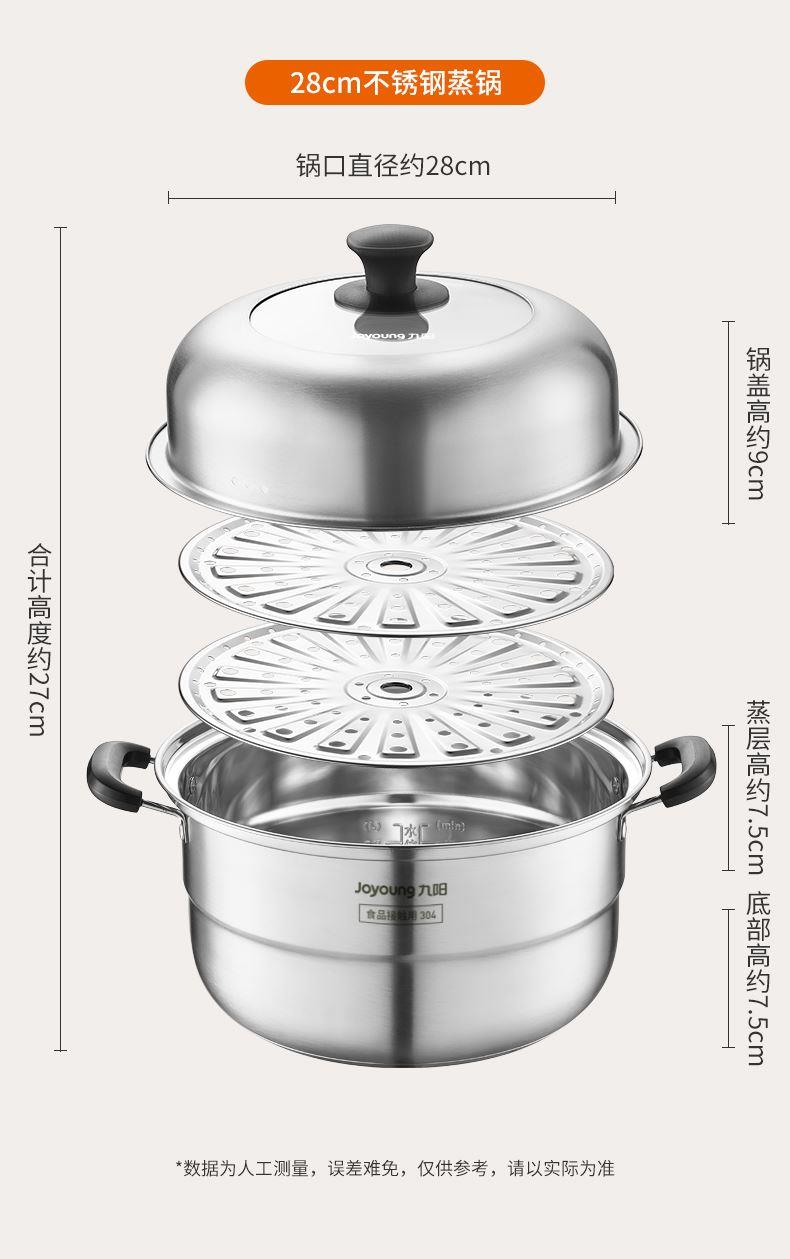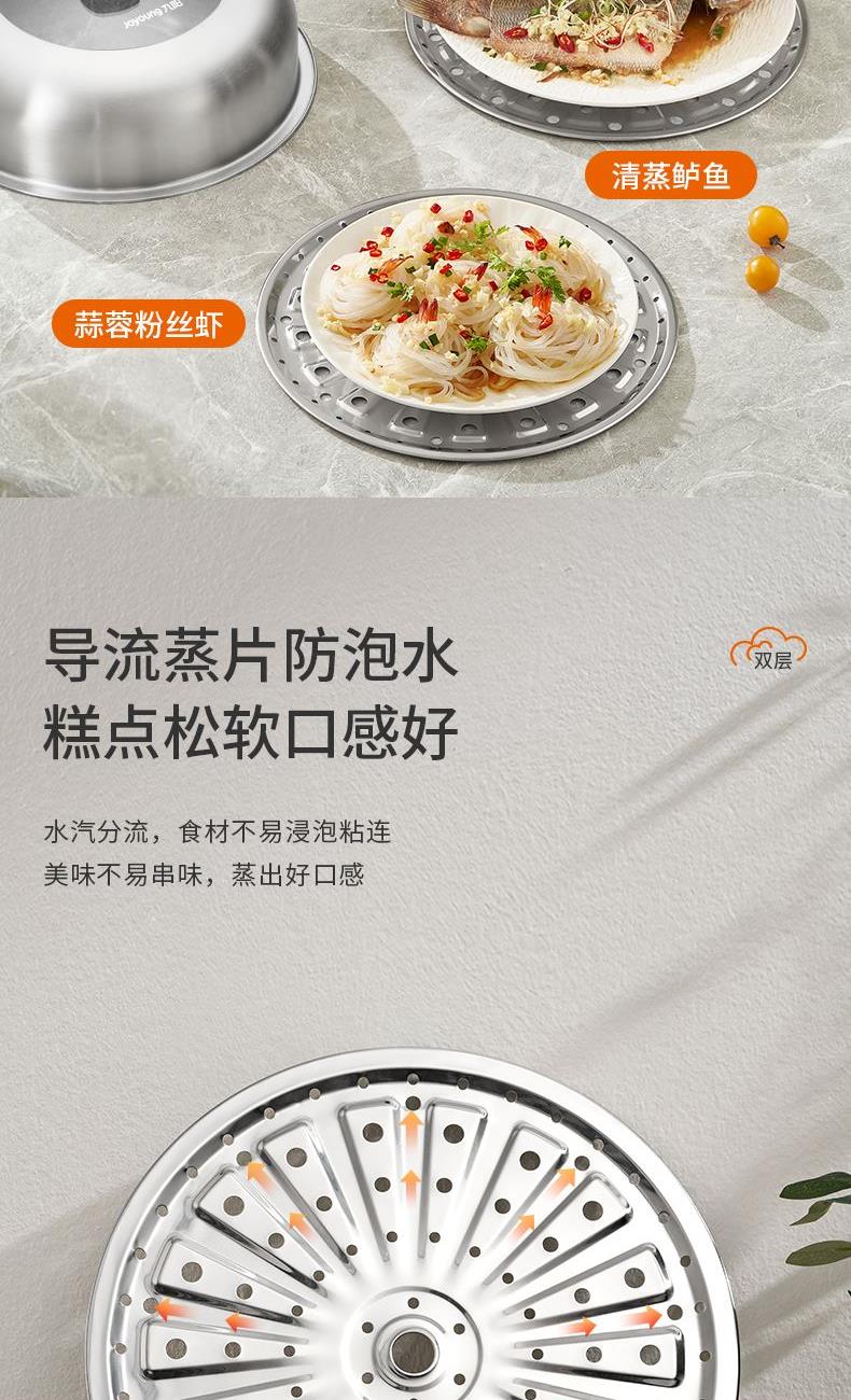 1、甄选304不锈钢材质,防锈耐用; 2、一锅多能,上蒸下煮,双层容量; 3、升级高拱盖,空间更大; 4、自带导流蒸片,食物不易串味; 5、三层加厚复合底,磁炉通用; 推 6、内壁水位线和时间参考,方便计量; 7、尺寸28cm;清单:底锅+蒸片x2+高拱盖子。