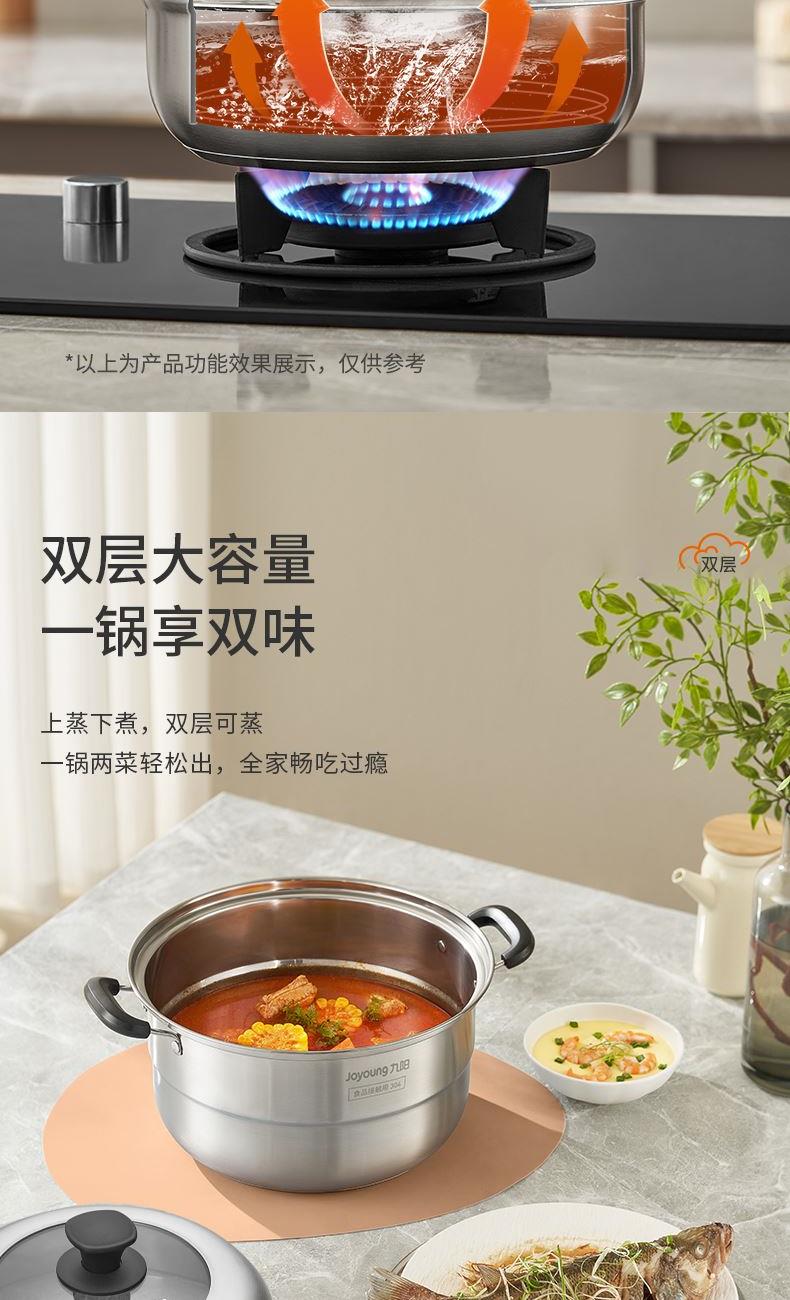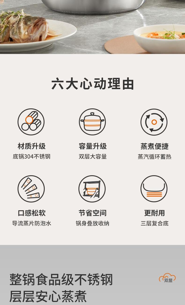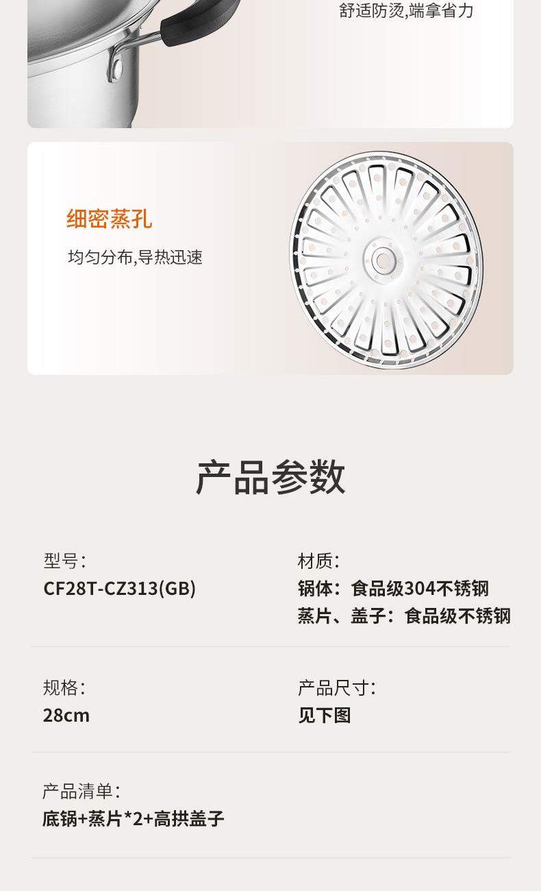 1、甄选304不锈钢材质,防锈耐用; 2、一锅多能,上蒸下煮,双层容量; 3、升级高拱盖,空间更大; 4、自带导流蒸片,食物不易串味; 5、三层加厚复合底,磁炉通用; 推 6、内壁水位线和时间参考,方便计量; 7、尺寸28cm;清单:底锅+蒸片x2+高拱盖子。