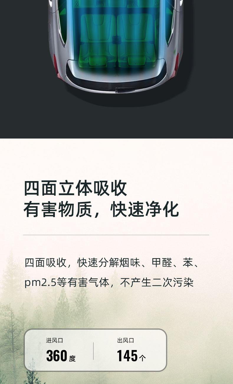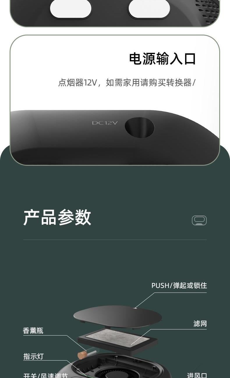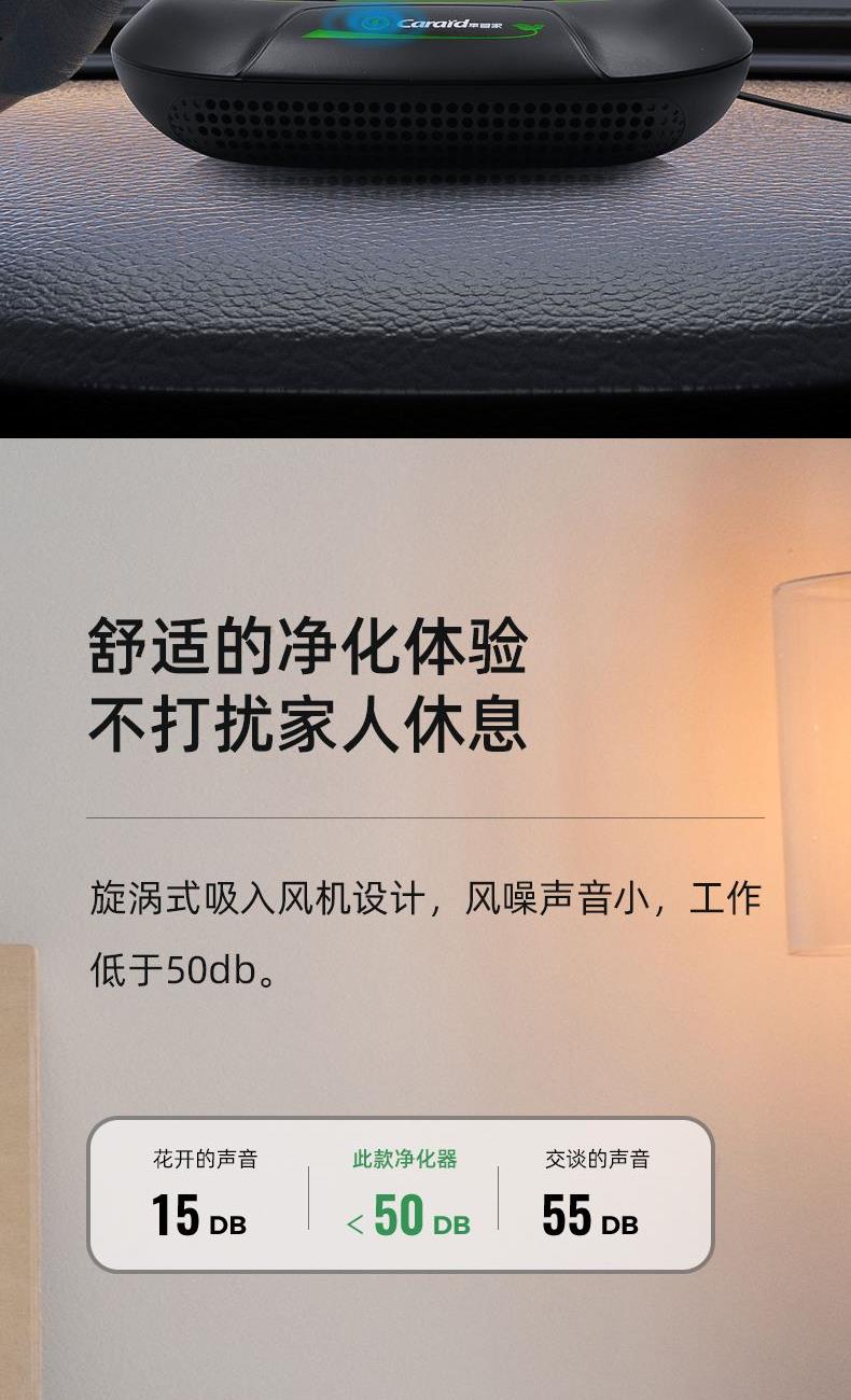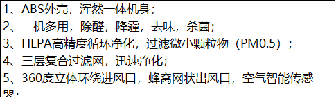 "1、ABS外壳,浑然一体机身; 2、一机多用,除醛,降霾,去味;3、HEPA高精度循环净化,过滤微小颗粒物(PM0.5); 4、三层复合过滤网,迅速净化;5、360度立体环绕进风口,蜂窝网状出风口,空气智能传感器;6、采用椰壳活性炭,约10倍去甲醛效果;7、内置香薰盒,RESET复位键; 8、额定电压:DC12V,额定功率:3.2W,正离子:700万/秒,负离子:1700万/秒,噪音:小于50dB(A)"