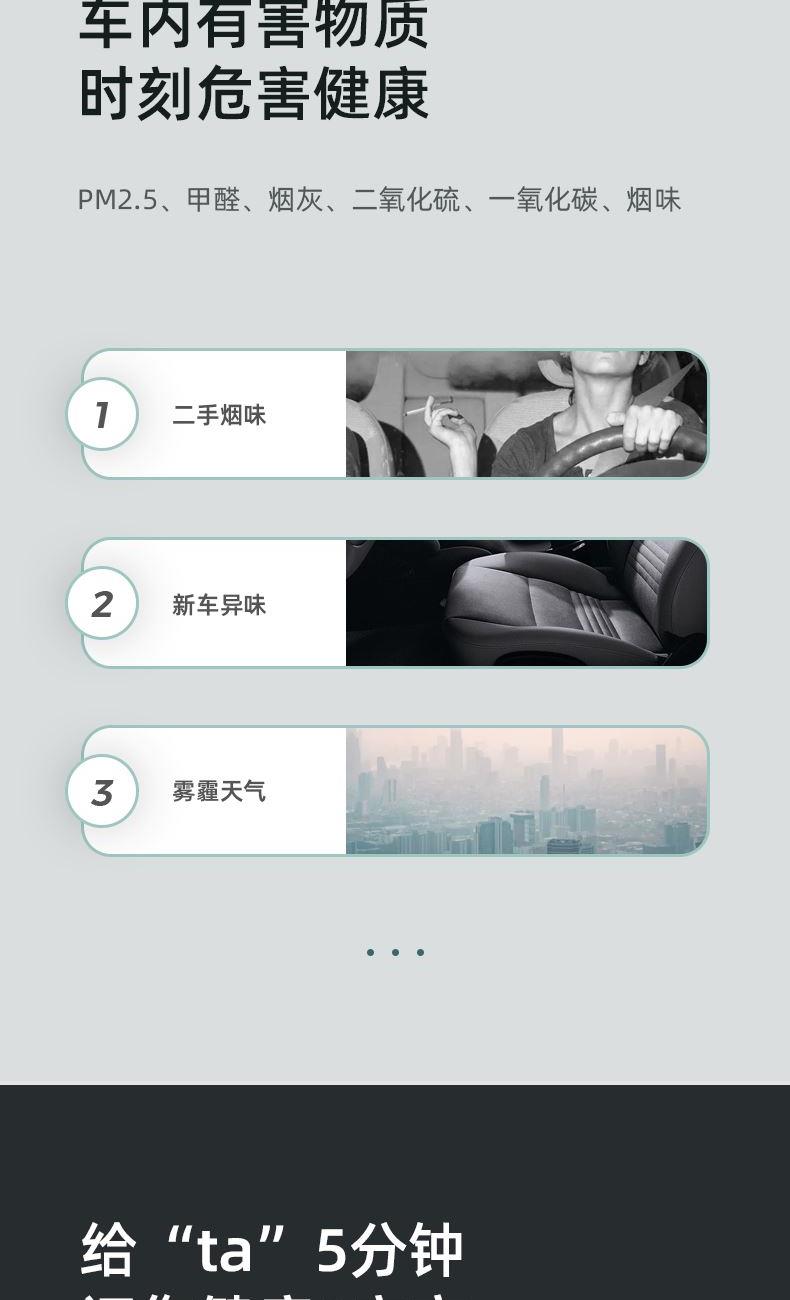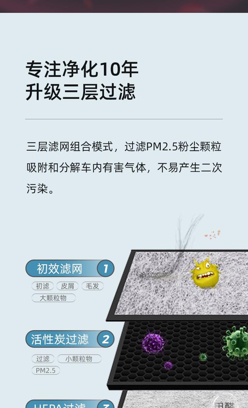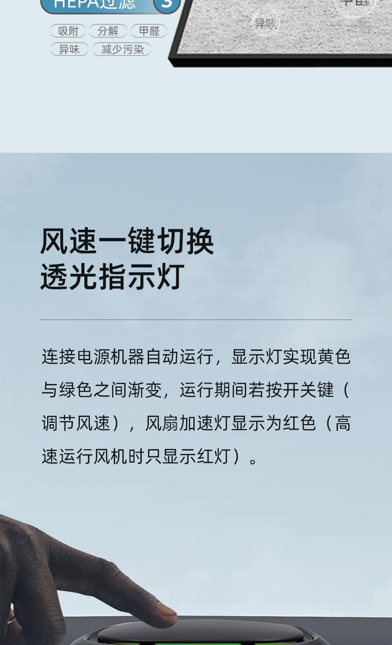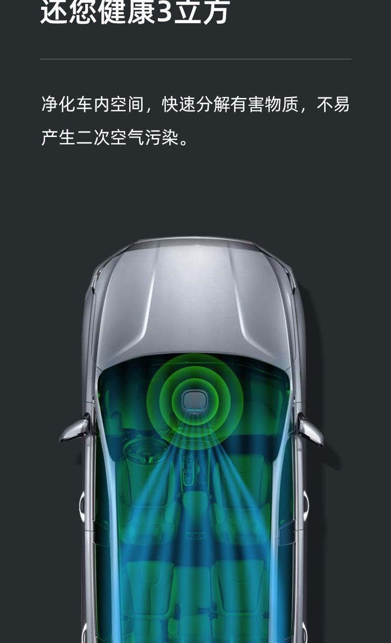 "1、ABS外壳,浑然一体机身; 2、一机多用,除醛,降霾,去味;3、HEPA高精度循环净化,过滤微小颗粒物(PM0.5); 4、三层复合过滤网,迅速净化;5、360度立体环绕进风口,蜂窝网状出风口,空气智能传感器;6、采用椰壳活性炭,约10倍去甲醛效果;7、内置香薰盒,RESET复位键; 8、额定电压:DC12V,额定功率:3.2W,正离子:700万/秒,负离子:1700万/秒,噪音:小于50dB(A)"