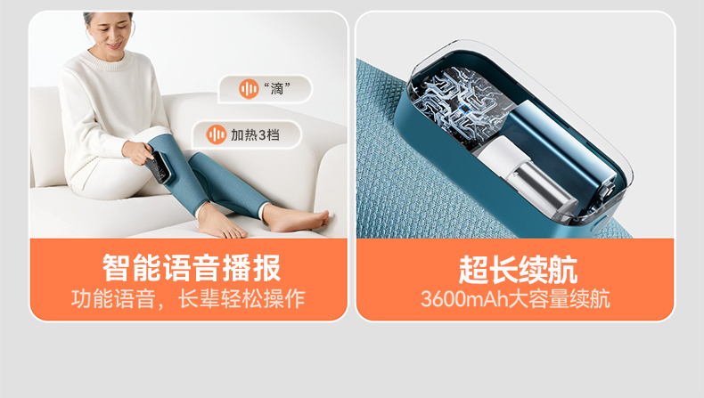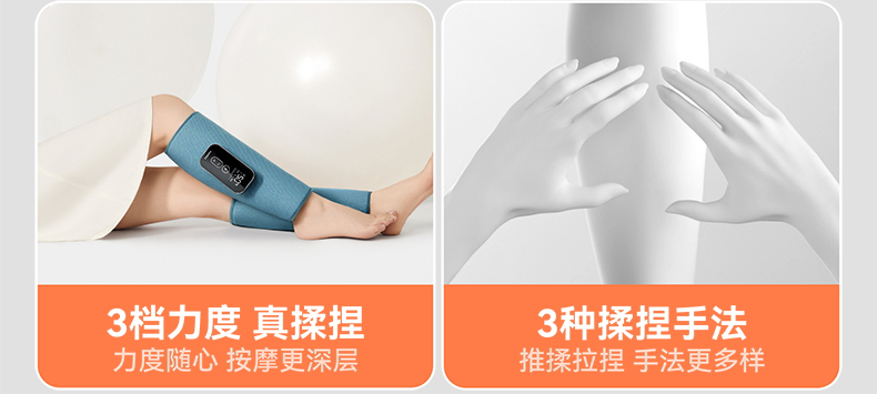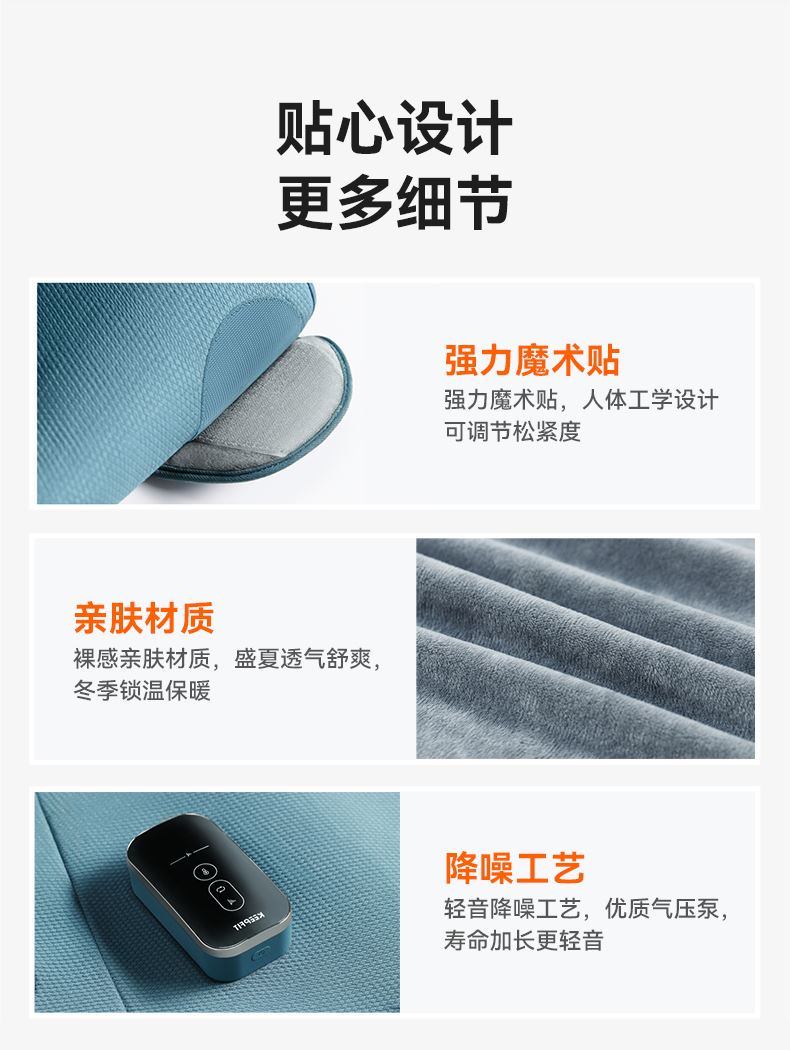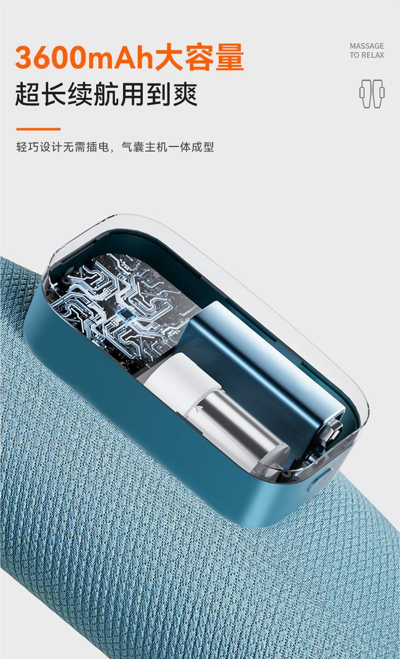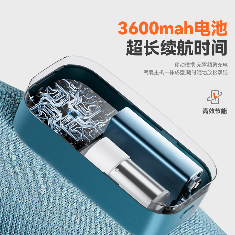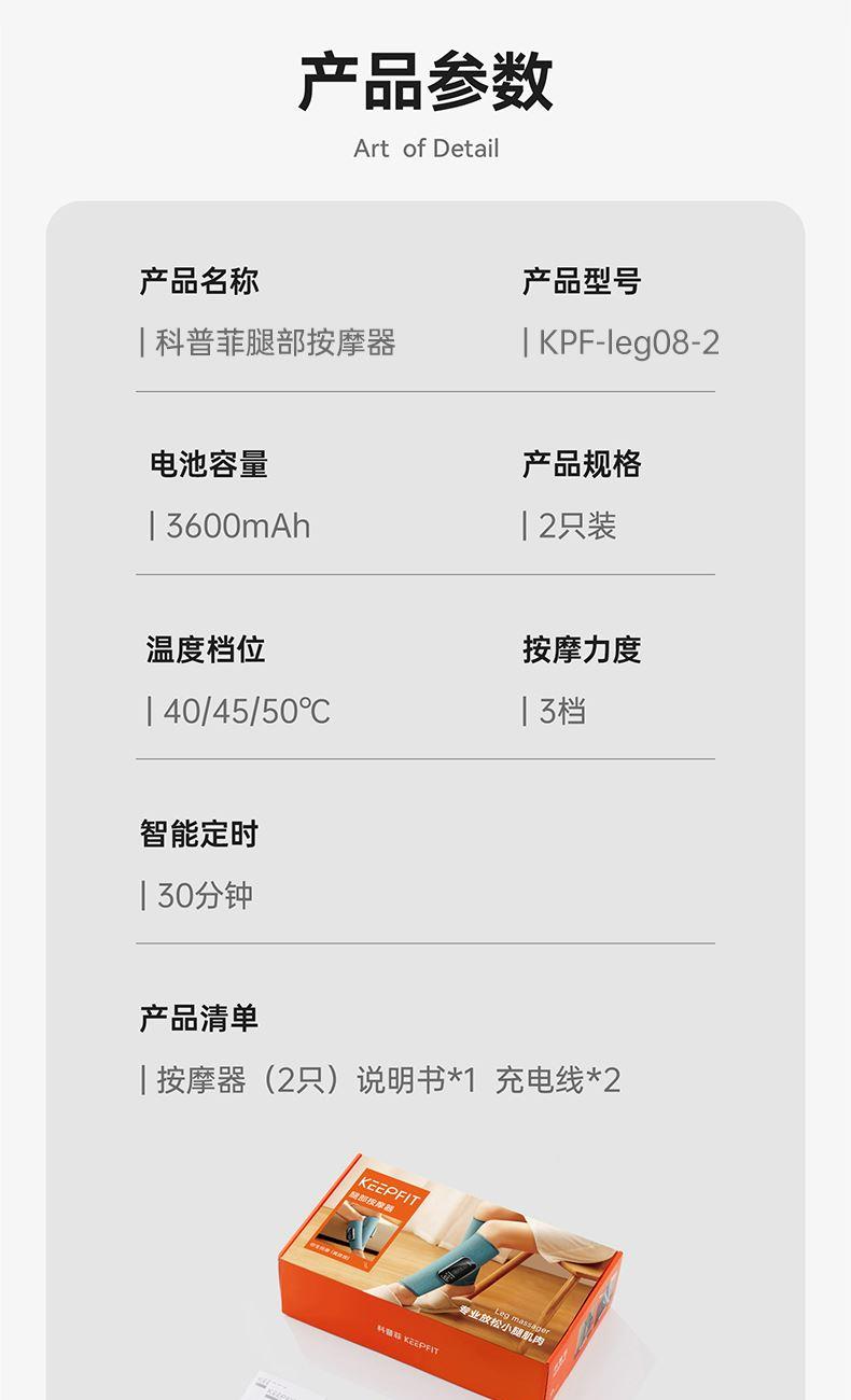 【电量】--3600毫安电量可用3小时左右(比市场上同类产品电池大三分一) 【大力度】--科普菲自研大气泵,按摩力度大速度快 【多样化】---3段式气嚢,可组合多样化按摩方式 【发热面积】--石墨烯发热片,发热面积大于市面上产品的一倍