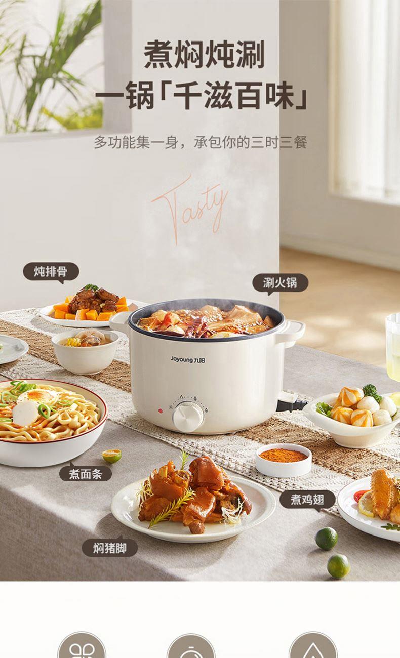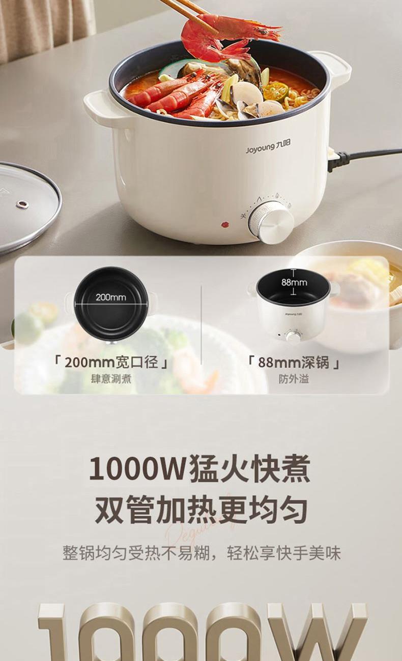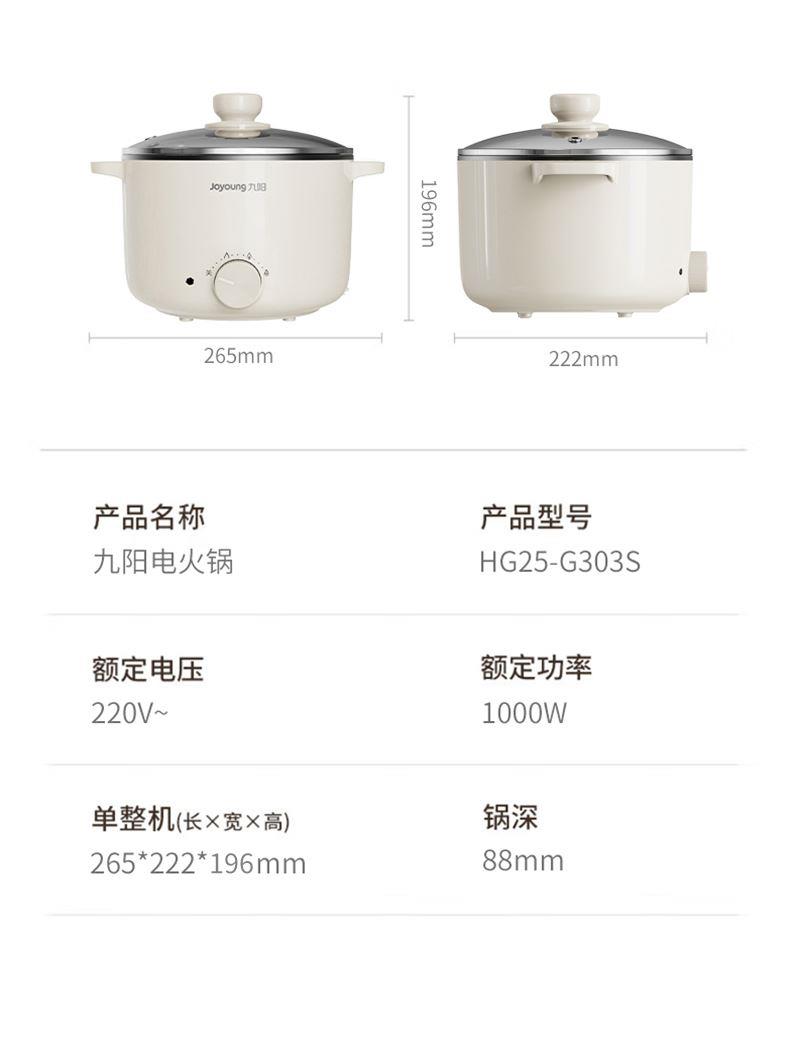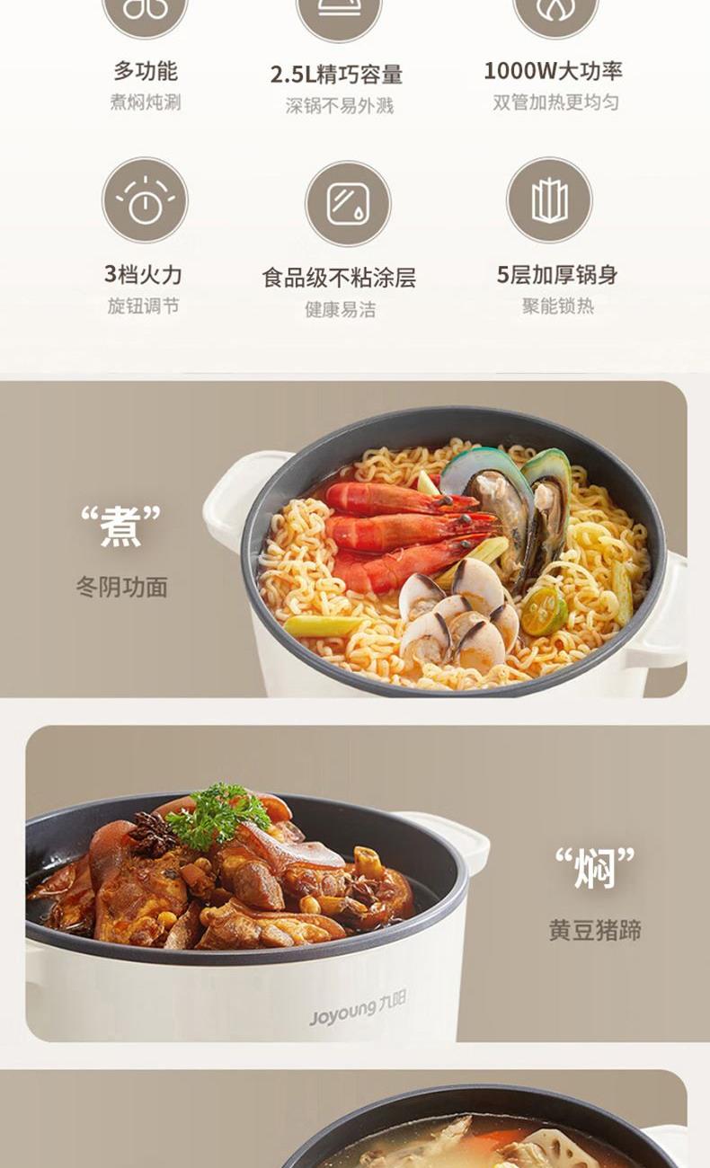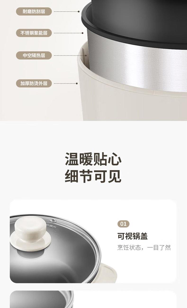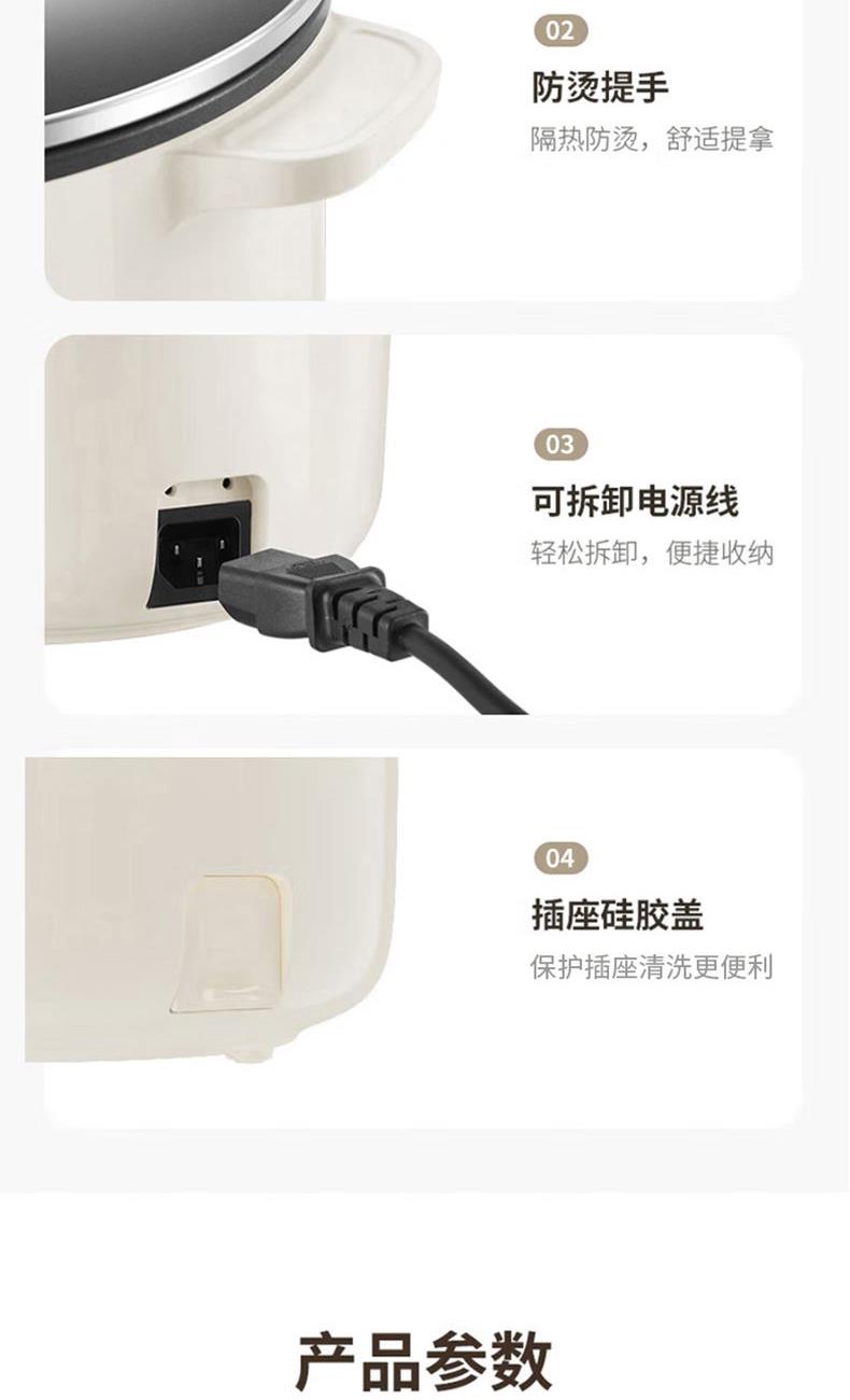 1、2.5L精巧容量,满足1~2人; 2、3档火力旋钮调节; 3、食品级不粘涂层内胆,安心易洁; 4可视透明上盖,烹饪尽在掌控; 5、底部散热孔,分离式电源线; 6、功率:1000W。
