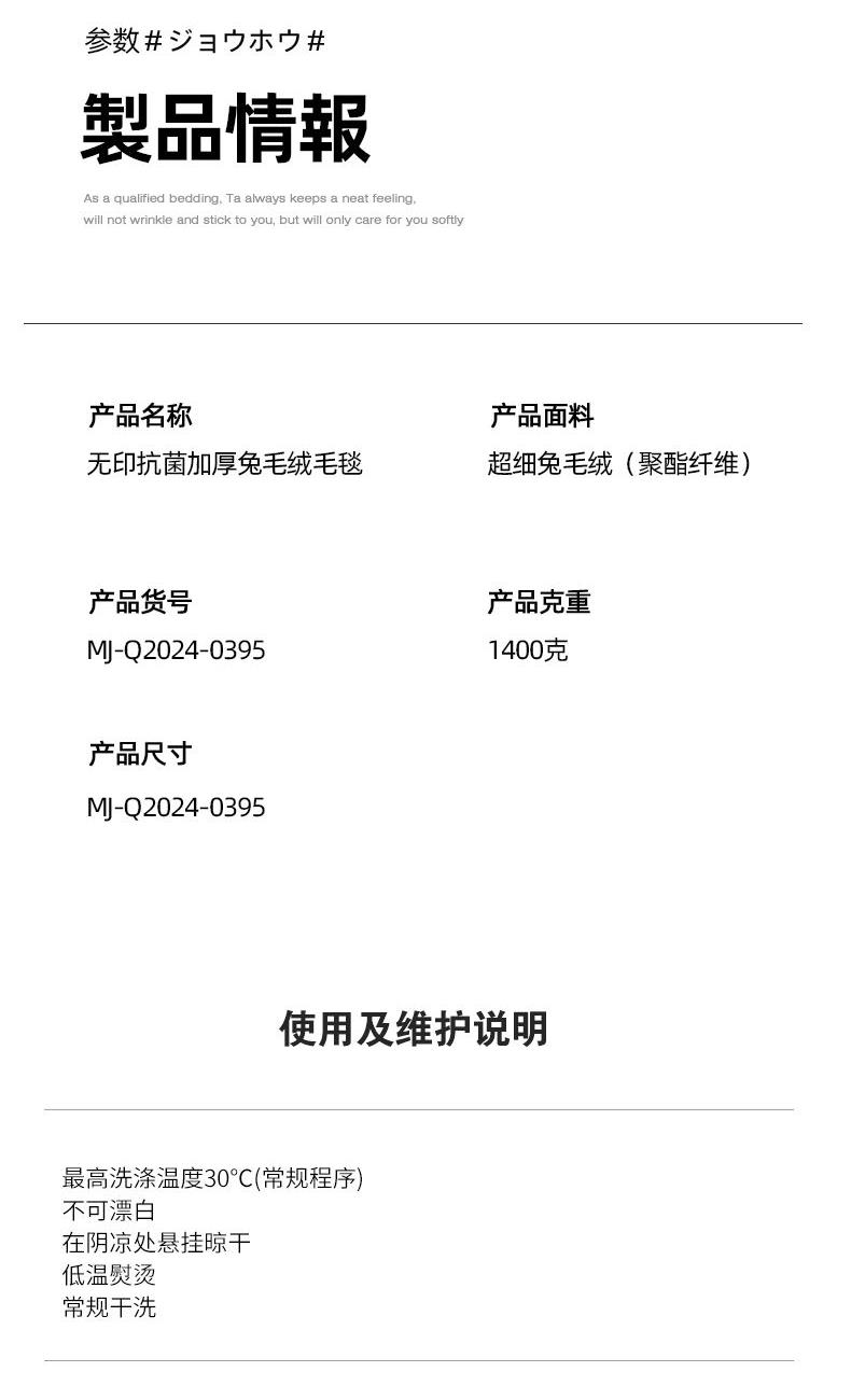 规 格:200×230(±2)cm 面 料:潮汐兔毛绒 克 重:1400g 新型超细兔毛绒面料,细腻,软糯,亲肤,触感犹如婴儿的肌肤. 加厚保暖,锁住温暖,从指尖到心间。 用心的品质把关,认真的细节处理,对用户的尊重。 無印格子设计,经典,让体验更舒适