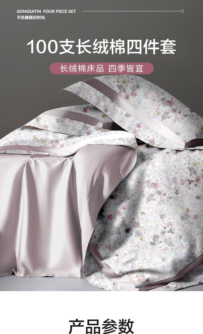 型号:TA080101AC1ZZ 规格:被套*1:200*230cm,床单*1:245*250cm, 枕套*2:48*74cm 材质:棉 纱支:100S, 适合1.5~1.8米标准床 包装:手提礼盒 产品特点:100支贡缎全棉,严选纱线,织就贡缎的细软轻薄,使产品柔和且具有飘逸感。植物纤维的透气和吸湿性。让我们被内保持舒爽,为睡眠带来全新体验的格调之美 。