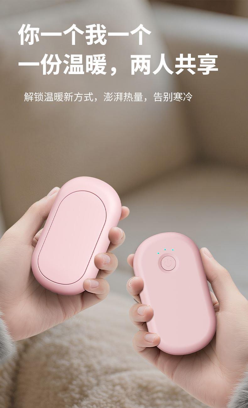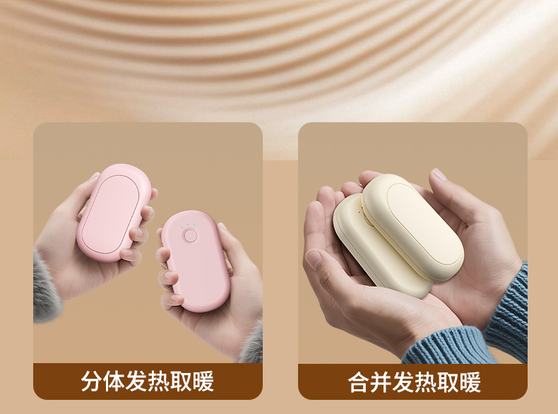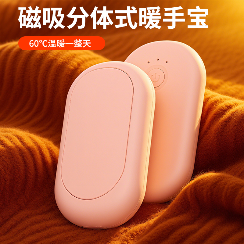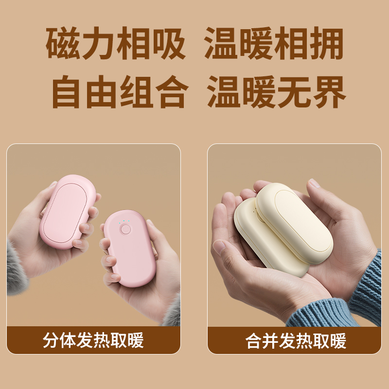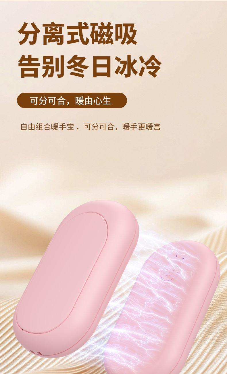 分体式磁吸暖手宝 输入:5V-1A 电芯及组合方式:聚合物 2000mAh*2=4000mAh 产品重量:118g、 产品尺寸:83*46*36mm、 材质:ABS+合金、 产品颜色:金色,粉色 输入接口:Type-C