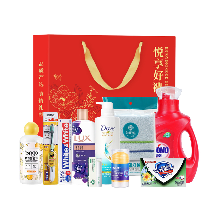 礼盒尺寸:32*8.5*24.5cm 包装尺寸:66*46.5*51CM 产品配置:(香型随机) 奥妙洗衣液1kg 芬洗发水380ml 洁丽雅毛巾 优思洁牙刷 凡士林润唇膏2.7g 舒肤佳香皂100g 凡士林倍护膏90g 沐浴球