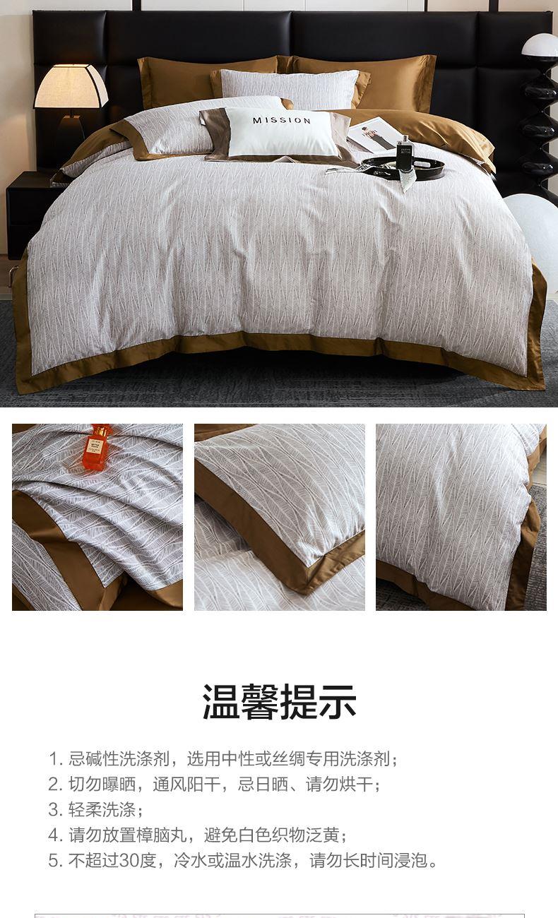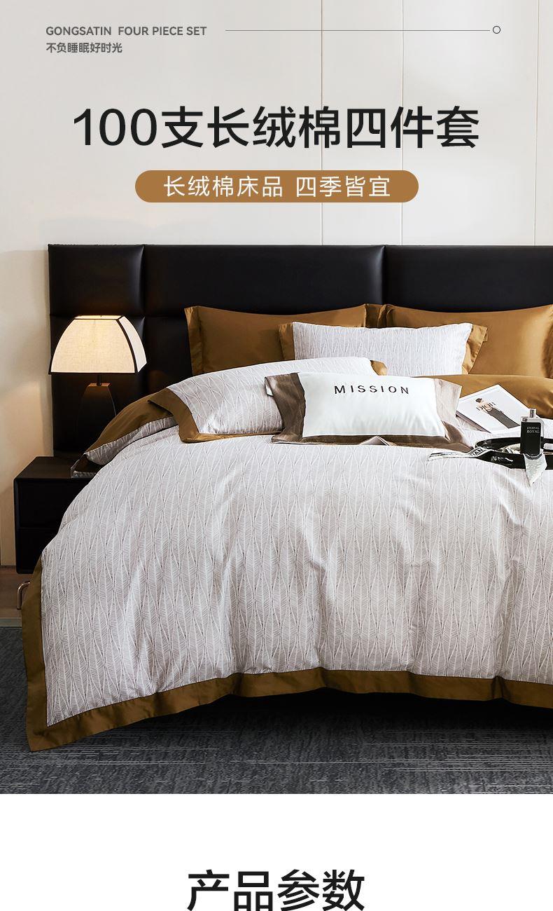 材质:棉 规格:被套*1:200*230cm,床单*1:245*250cm,枕套*2:48*74cm 纱支:100S 包装:手提礼盒 特点:100支贡缎长绒棉,严选纱线,加之高支高密的贡缎织造工艺,使得床品手感极其柔软顺滑。 吸湿透气:长绒棉本身吸水性好,能够快速吸收并散发人体在睡眠中产生的湿气和热气,保持被窝内干爽舒适的睡眠环境。 适合追求高品质睡眠和生活享受的人群,无论是在寒冷 的冬天还是炎热的夏天,都能提供舒适的睡眠体验,为 卧室增添温馨和奢华的氛围 。