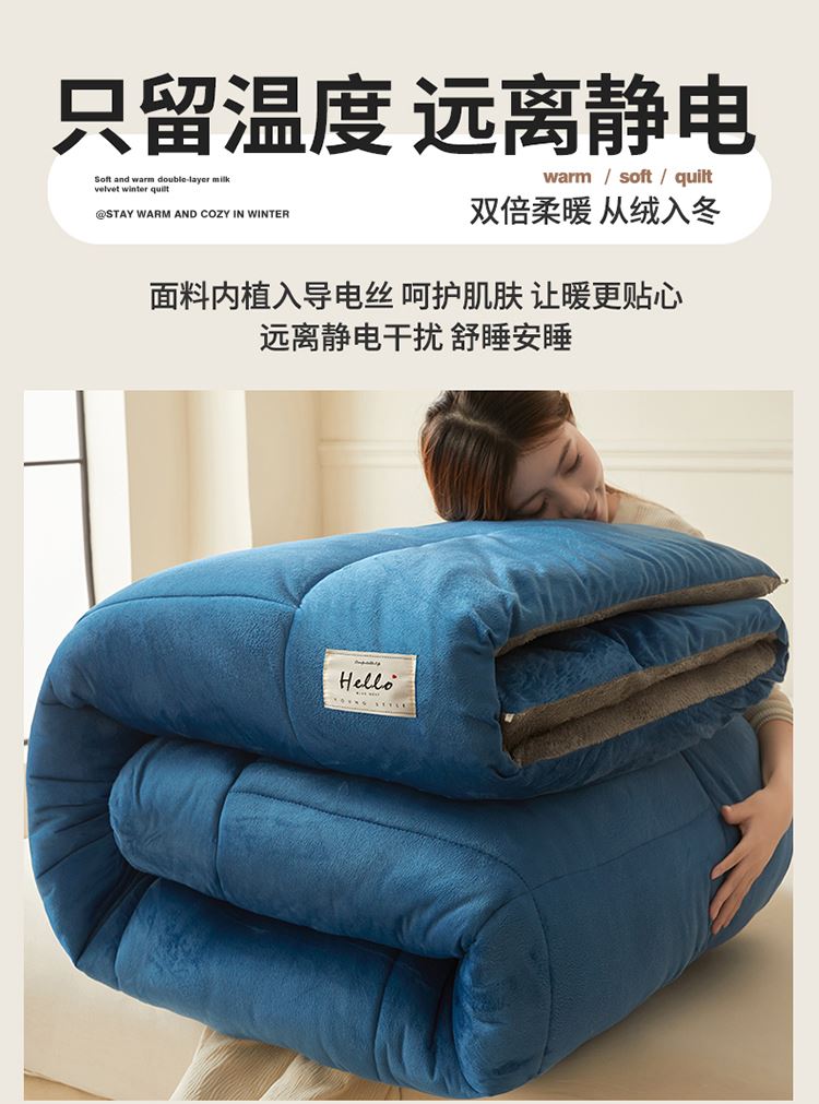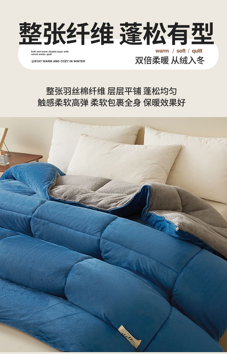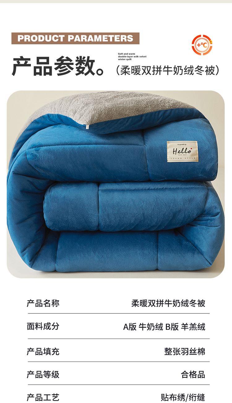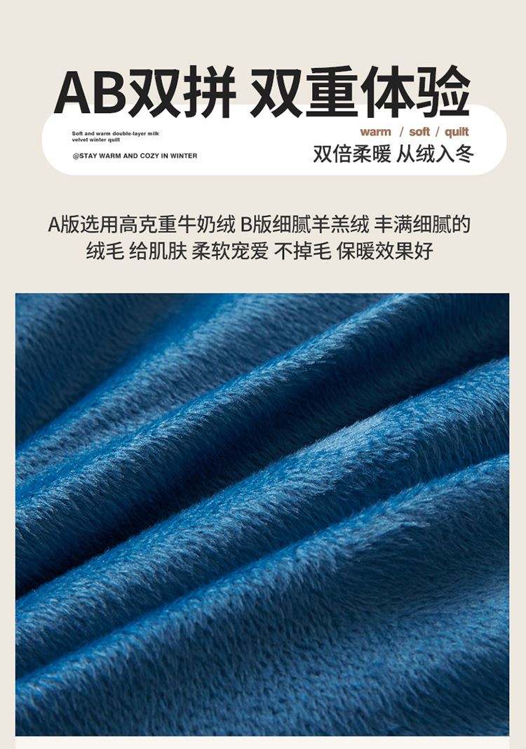 1:“绒绒”!暖意温柔“贴贴” 牛奶绒+羊羔绒双面双感加厚冬被 2:AB双拼 双重体验 双倍柔暖 从绒入冬 3:丰满细腻的绒毛 给肌肤 柔软宠爱 不掉毛 保暖效果好 4:整张羽丝棉纤维 层层平铺 蓬松均匀触感柔软高弹 柔软包裹全身 保暖效果好 尺寸:200*230cm 重量:3kg 面料:牛奶绒+羊羔绒 包装:彩盒