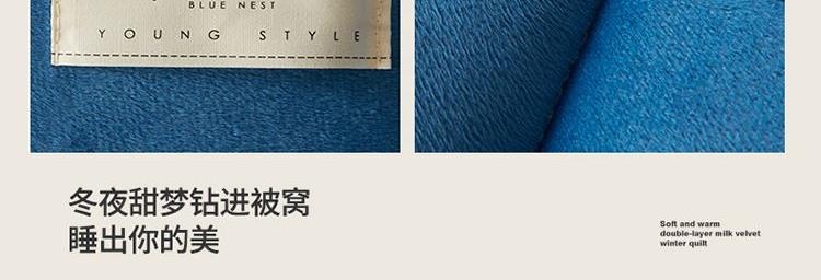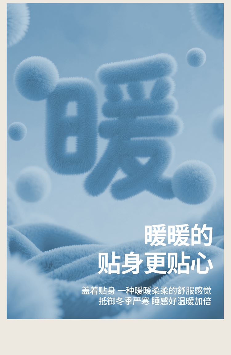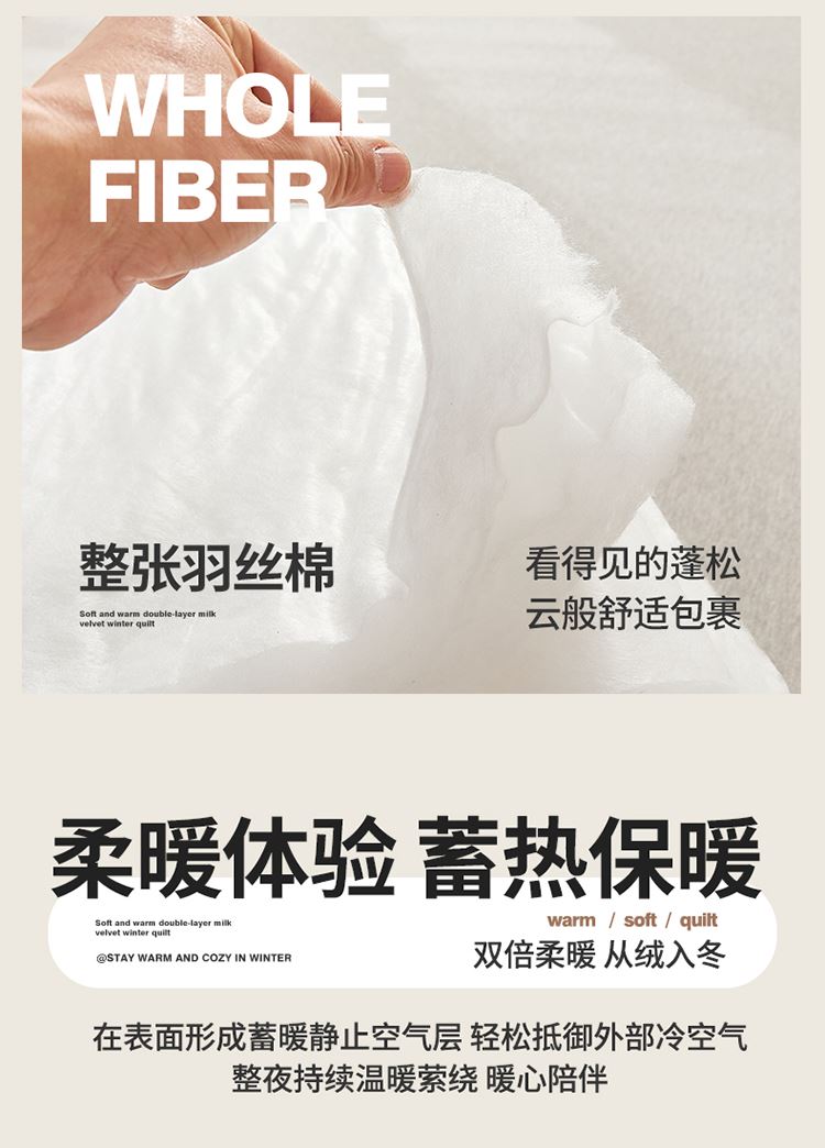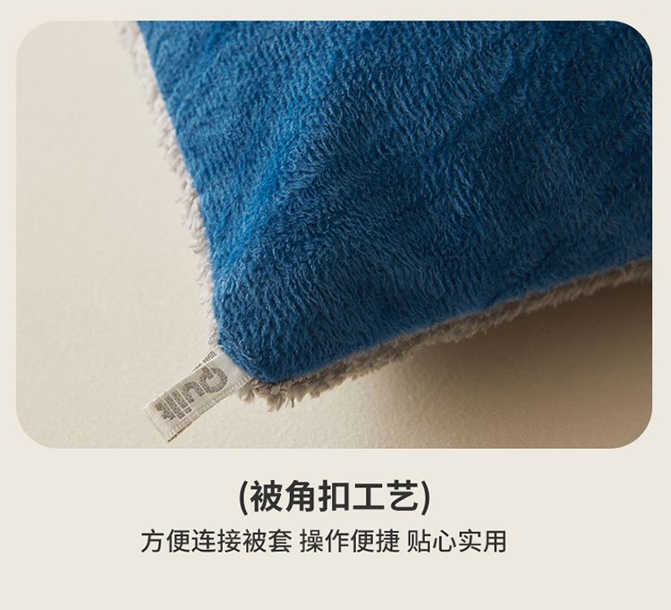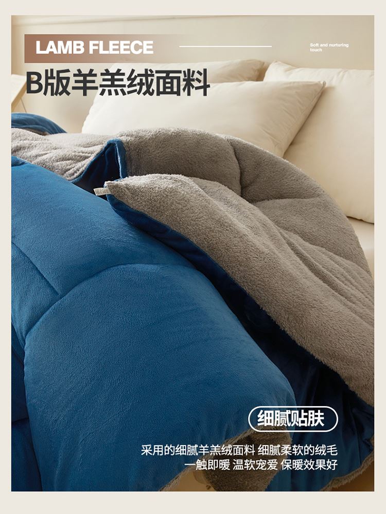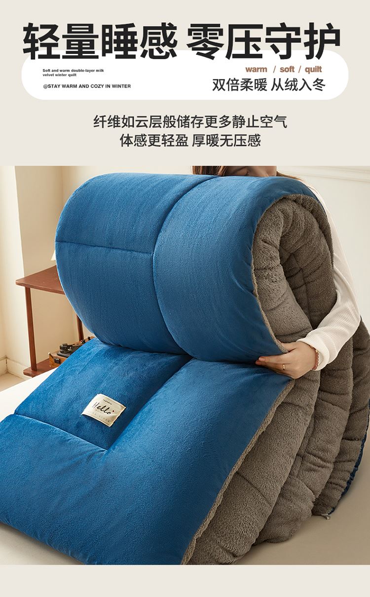 1:“绒绒”!暖意温柔“贴贴” 牛奶绒+羊羔绒双面双感加厚冬被 2:AB双拼 双重体验 双倍柔暖 从绒入冬 3:丰满细腻的绒毛 给肌肤 柔软宠爱 不掉毛 保暖效果好 4:整张羽丝棉纤维 层层平铺 蓬松均匀触感柔软高弹 柔软包裹全身 保暖效果好 尺寸:200*230cm 重量:3kg 面料:牛奶绒+羊羔绒 包装:彩盒